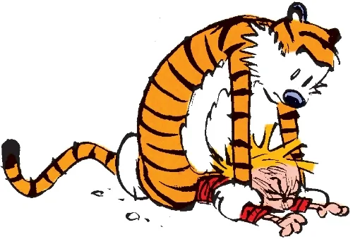 How to Assemble: Bleach and style hair in the classic "forward spiked" style, then dress as usual, careful to let hair dry sufficiently before putting on shirt to keep it safe from accidental bleaching. Once in costume, gently coax Bengal tiger out of the back of your car, where you've kept it pinned since smashing through the retaining wall of your local zoo's jungle habitat. If you've tranquilized the tiger prior to transport, you may find him sluggish and difficult to move, in which case you should rebrand your costume to accommodate this "real life Hobbes" aspect, when Hobbes appears as a mere stuffed animal. The tiger will likely come around in a few hours, whereupon you can transition into the "Calvin returning home from school" costume, when Hobbes tackles the crap out of him and begins to violently maul his face and neck (see below).
